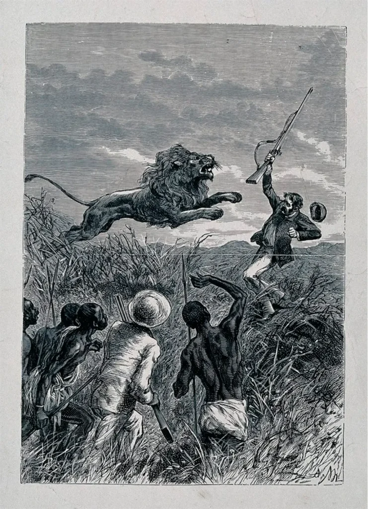 Las narraciones de Livingstone generalmente incluían sus aventuras. Esta ilustración representa su lucha contra un león. / Foto: Dominio público