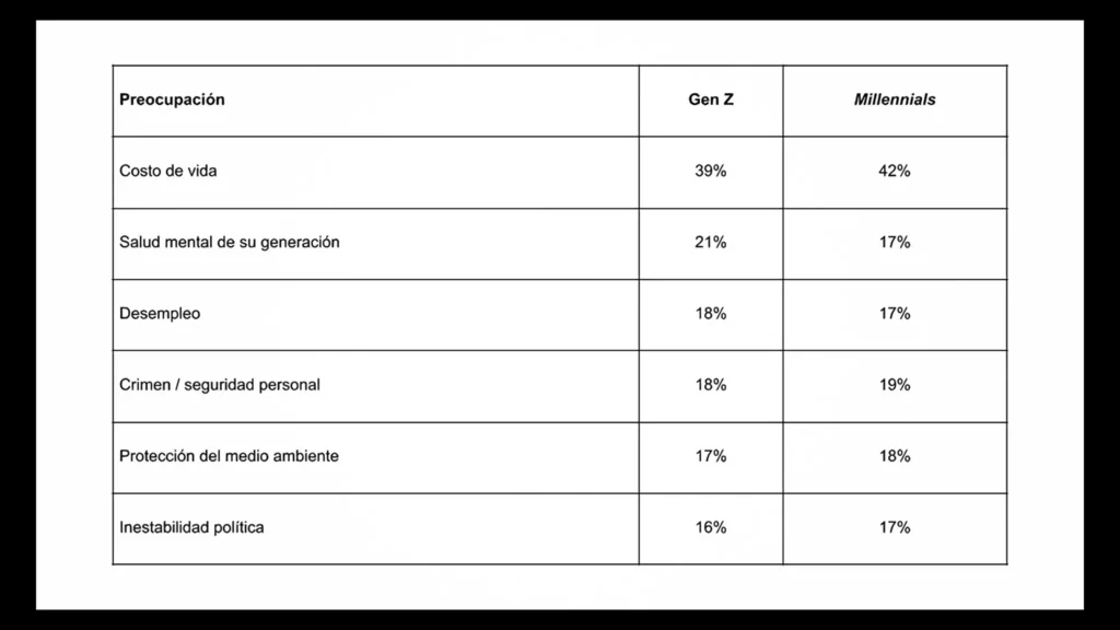 La Deloitte Global’s 2025 Gen Z and Millennial Survey (Encuesta Gen Z y millennials 2025 de Deloitte Global) nos permite aclarar un poco más este panorama, pues tiene resultados más amplios y variados de esos dos grupos de jóvenes, tanto por edad como por ubicación geográfica. Según los resultados obtenidos por esta firma global de consultoría, la generación Z y los millennials comparten las mismas preocupaciones y, por lo tanto, tienen niveles similares de incertidumbre respecto al futuro. De hecho, en ciertos casos las cifras de los millennials superan las de los centennials.