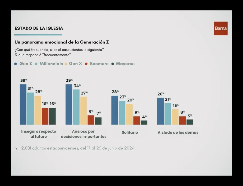 El resultado es una generación que está aprendiendo a tomar decisiones trascendentales sin herramientas, sin acompañamiento y muchas veces sin esperanza. Barna lo resume bien: tienen el lenguaje emocional, pero no el ancla. Saben nombrar su ansiedad, pero no saben qué hacer con ella. Precisamente, es aquí donde tiene lugar el aumento progresivo de los sentimientos negativos entre una generación y otra: ¿será que las generaciones más actuales, como la Z y los millennials, son más conscientes de sus emociones y por eso sus cifras de sentimientos negativos son más altas?