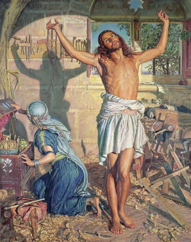 Quizás esta obra de la segunda mitad del siglo XIX no sea tan conocida como otras, pero resulta profundamente sugerente. En ella se muestra el interior de un taller de carpintería en Nazaret. Jesús aparece de pie, con el torso desnudo, junto a un caballete de aserrado sobre el que ha apoyado el serrucho. Su mirada se dirige al cielo, mientras la expresión de Su rostro parece mezclar dolor y éxtasis, y Sus brazos aparecen levantados por encima de la cabeza.