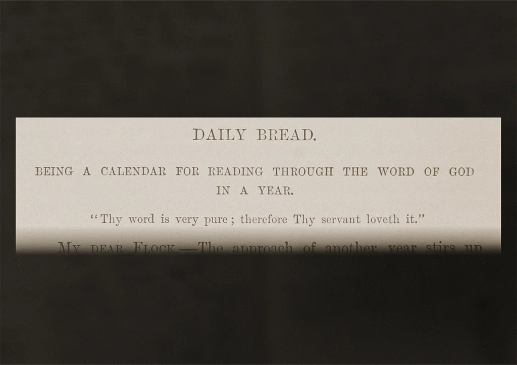 El estudio sistemático y continuo de la Palabra de Dios finalmente condujo a lo que puede ser el legado más significativo de M’Cheyne: un plan de lectura bíblica. Le dijo a St. Peter’s que había deseado durante mucho tiempo “preparar un esquema de lectura de las Escrituras (…) de modo que toda la Biblia pudiera ser leída una vez por ustedes en el año, y que todos se alimentaran en la misma porción del verde pasto al mismo tiempo”. Así que, en 1842, M’Cheyne creó un plan de lectura bíblica para su iglesia. Lo publicó a comienzos de 1843 como un pequeño folleto, Daily Bread: Being a Calendar for Reading through the Word of God in a Year (Pan diario: siendo un calendario para leer la Palabra de Dios en un año).