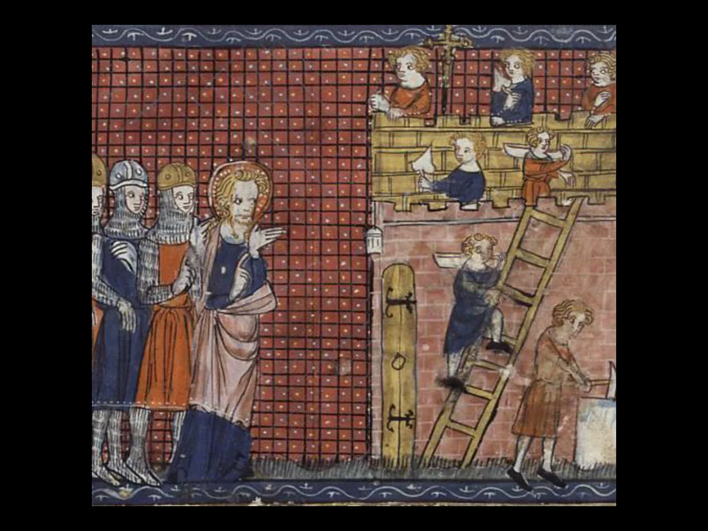 Según una ilustración de un manuscrito francés del siglo XIV, esta imagen representa a San Valentín de Terni presenciando la construcción de su basílica. / Imagen: Best Latin